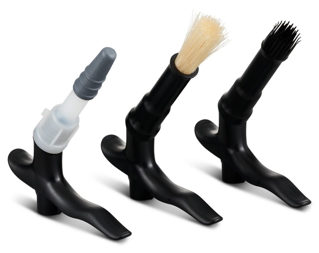 Первая — насадка LinRoc, обеспечивающая более точное нанесение силиконов и клеев. Вторая — Nylon Hair, подходящая для смазок и паст, со съёмной щёточкой. Третий аппликатор Glide, Plastic Brush, также идеально подходит для нанесения паст и смазок, а его монолитный материал способствует более эффективному использованию.