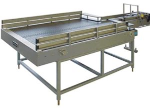 Стол имеет две направляющие рельсы и две конвейерные ленты для подачи баллонов в два модуля